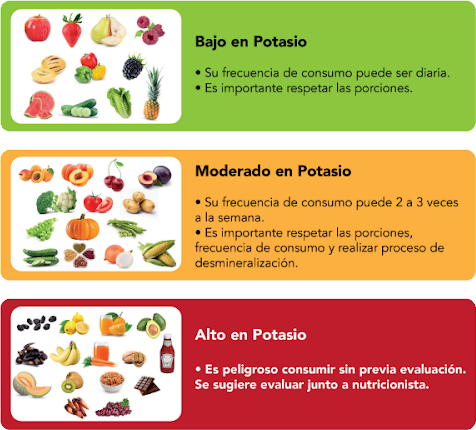 Para identificar el contenido de potasio utilizaremos la educación del semáforo renal, que consiste en identificar con los colores la cantidad de este mineral: el color verde representa una baja cantidad; amarillo, un moderado contenido; y rojo, alto/muy alto contenido de potasio. A su vez, los colores ayudan a comprender la frecuencia de consumo que se debería incluir para mantener un equilibrio de este mineral en la porción, frecuencia de consumo y combinación que se desea hacer para no aumentar de manera peligrosa este mineral en su organismo